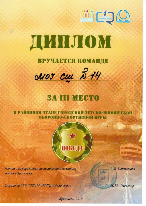 Команды средней школы № 14 «Юный кадет» и «Ярославский кадет» достойно прошли все испытания, получили массу положительных эмоций, приобрели новые знания, закрепленные на практике, и завоевали два III общекомандных места в военно-спортивной игре «Зарница». По сумме побед в отдельных видах соревнований, личных зачетов, внеконкурсных испытаний кадеты 6-11 классов были награждены тридцатью тремя грамотами.